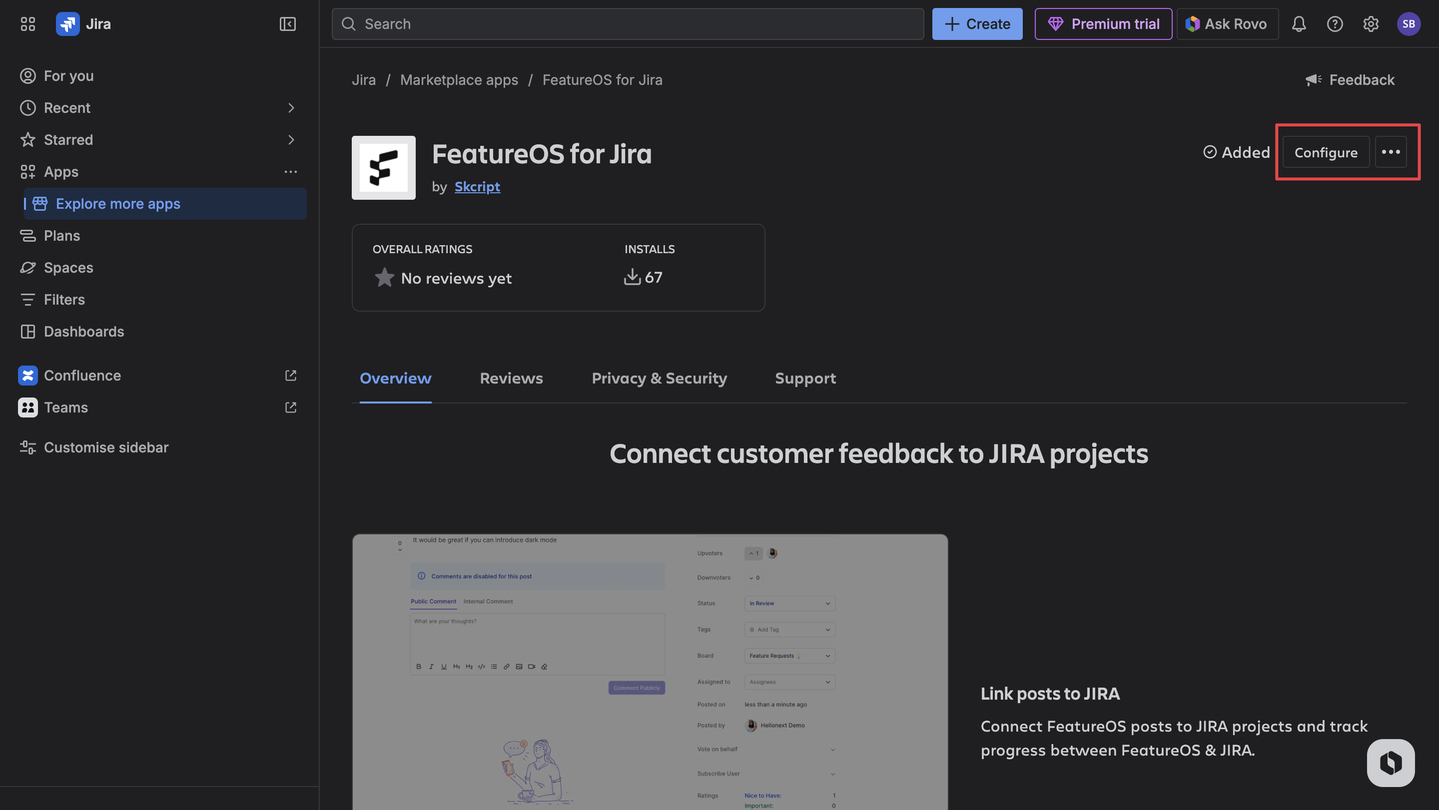 Go back to your FeatureOS dashboard and navigate to JIRA in the Integrations section. If you already have the page open, please refresh it.