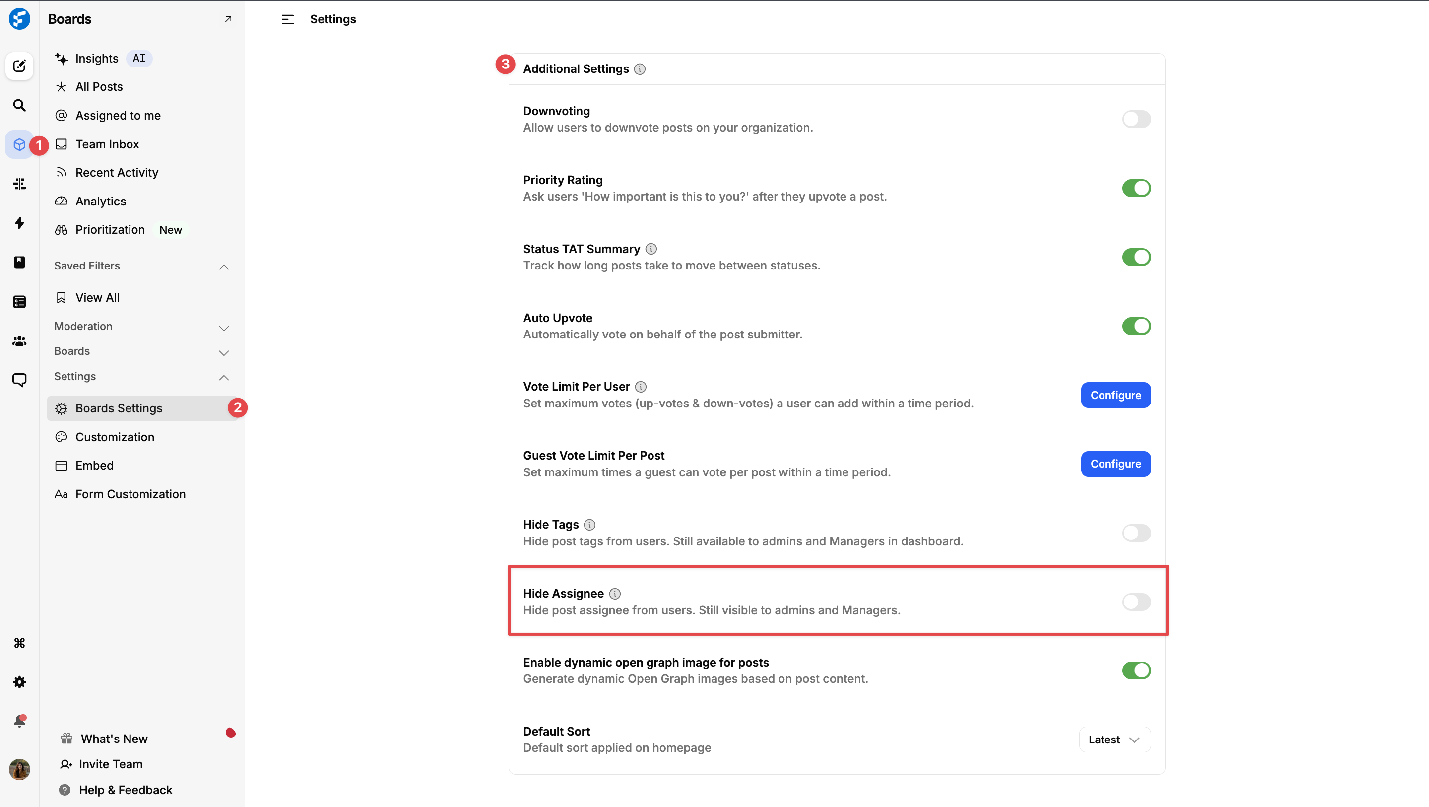 Dashboard â Boards â Settings â Boards Settings â Additional Settings â Hide Assignee.