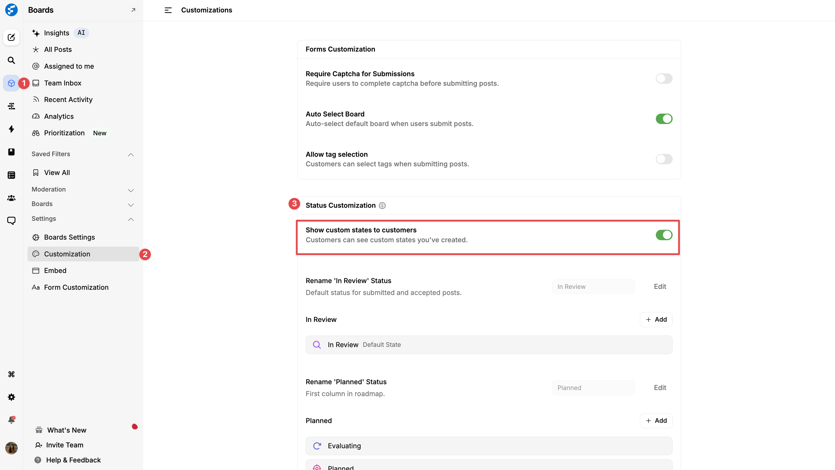 Dashboard â Boards â Settings â Customization â Status Customisation â Show custom states to customers.