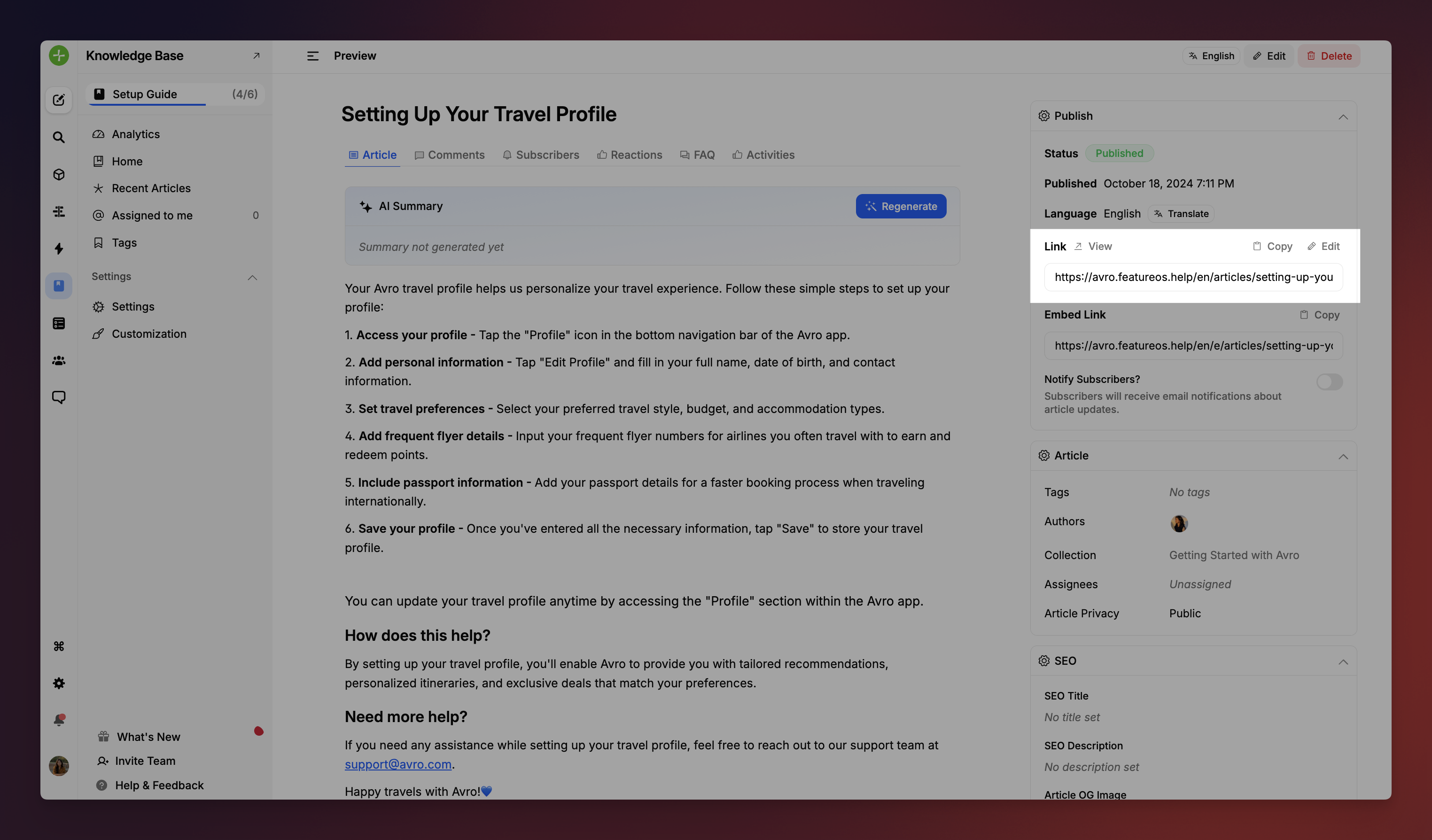 The easiest way to share your Knowledge Base is with a direct link. Every collection and article in your KB comes with its own unique URL. You can copy this link and share it through emails, support tickets, onboarding flows, or even chat conversations. Itâs the fastest method for pointing users to exactly the content they need, without extra steps. You can find the option to share the Link on the rights side of your Knowledge Base Article.