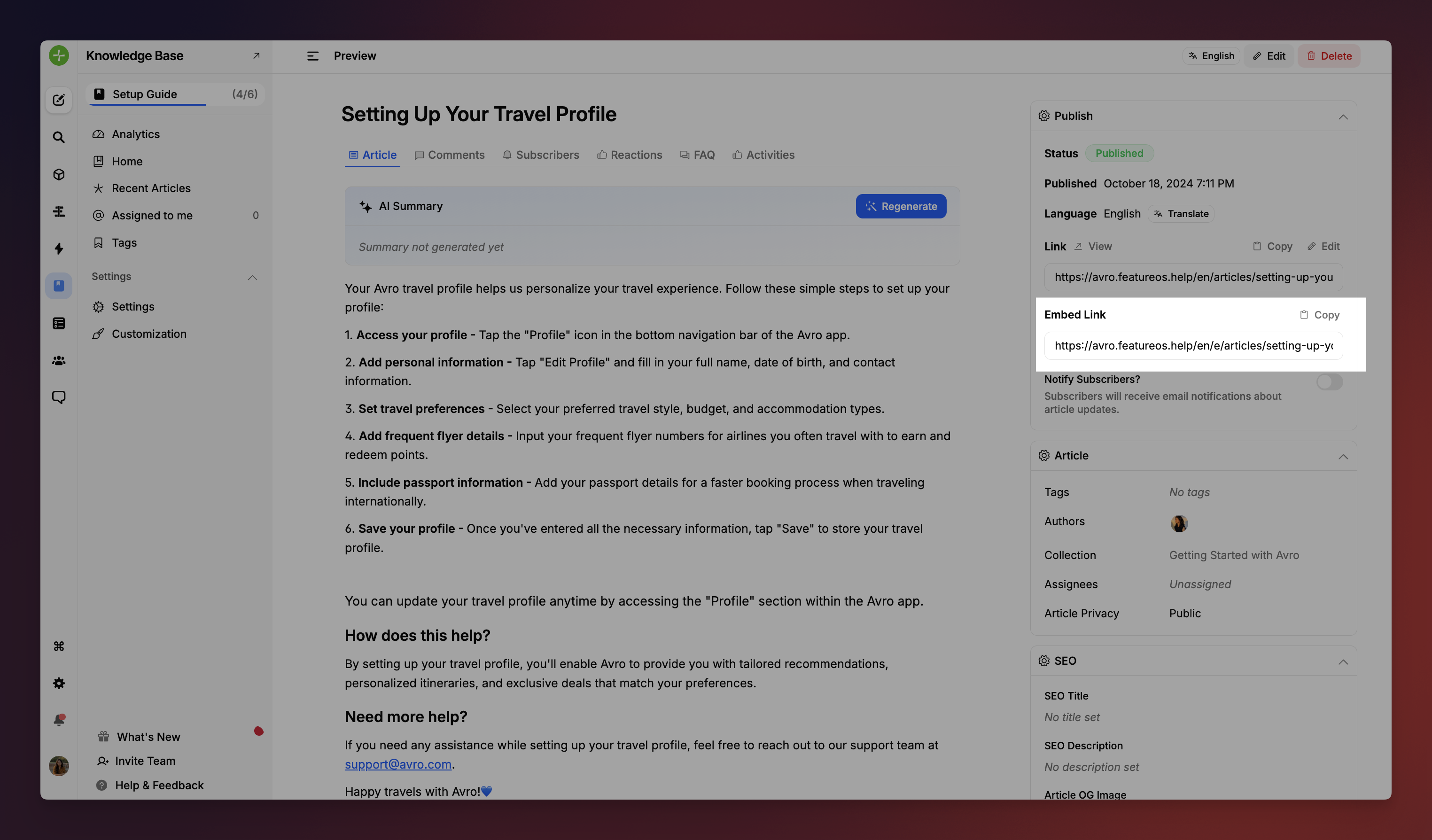 Embedding allows you to bring your Knowledge Base directly into your website or app. By copying the embed code from FeatureOS and pasting it onto your site, you can make articles available right where your users already are. This is especially useful for documentation pages, onboarding guides, or a dedicated support section, since it avoids redirecting users away from your product. You can find the option to Embed on the rights side of your Knowledge Base Article.